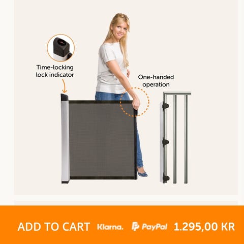 Sammenrullende baby gitter/net fra Lascal kan dække en åbning på og til 120cm.