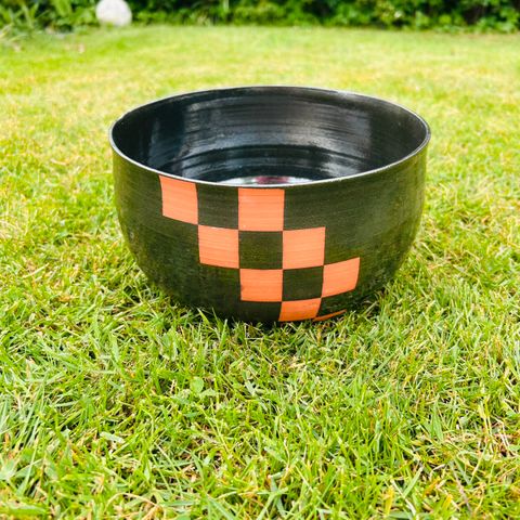 Per keramik skål i blå og beige farver. Skålen har en rund form med en glat overflade, lavet af lys keramik. Den har en bred åbning og en stabil bund.