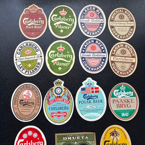 Mange forskellige øl og sodavands etiketter i mappe.