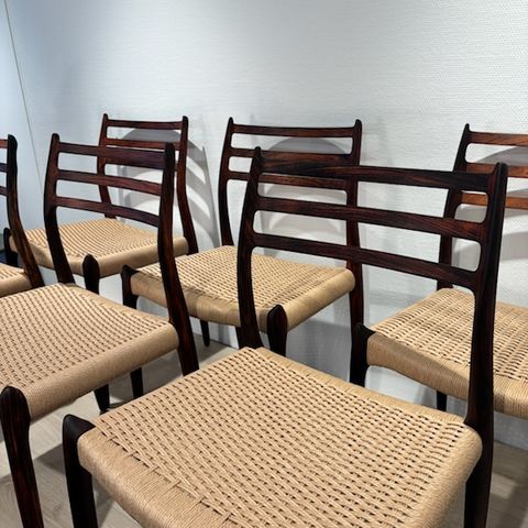 Niels O. Møller 4 smukke spisebordsstole, model 85, med stel af massiv palisander, alle ny flettede. Sælges samlet. Levering kan tilkøbes