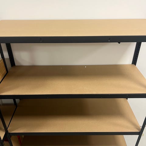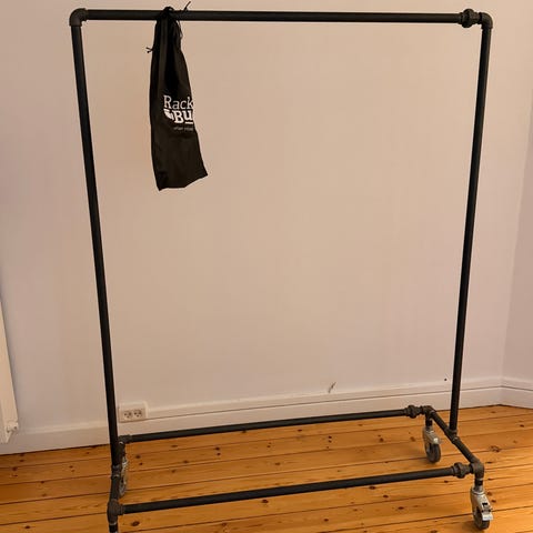 Reolsystem i sort metalramme med hylder i træ. Designet til opbevaring og organisering af forskellige genstande. Passer til brug i hjem eller kontormiljøer, hvor der ønskes en kombination af metal og træmaterialer.