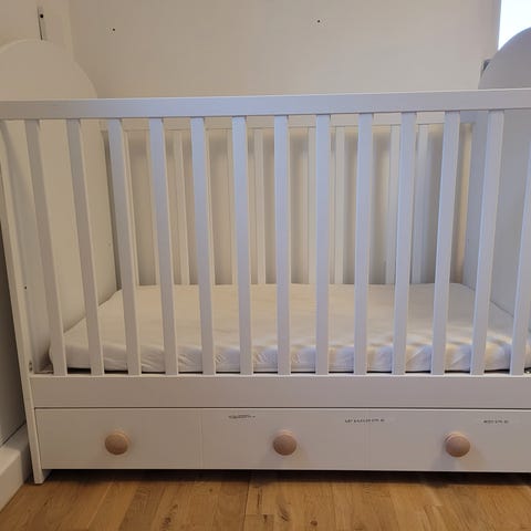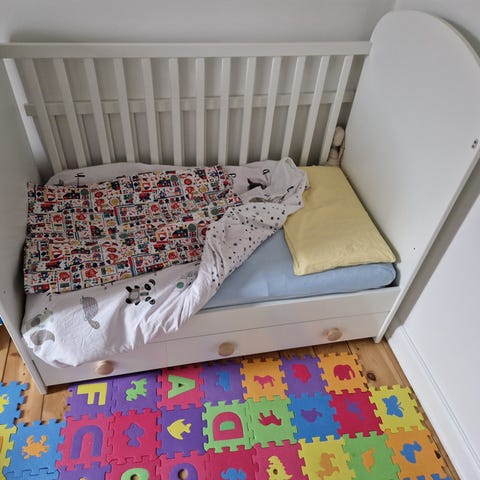 Den ene side af tremmesengen kan afmonteres, når barnet bliver større og selv kan kravle op i eller ud af sengen.