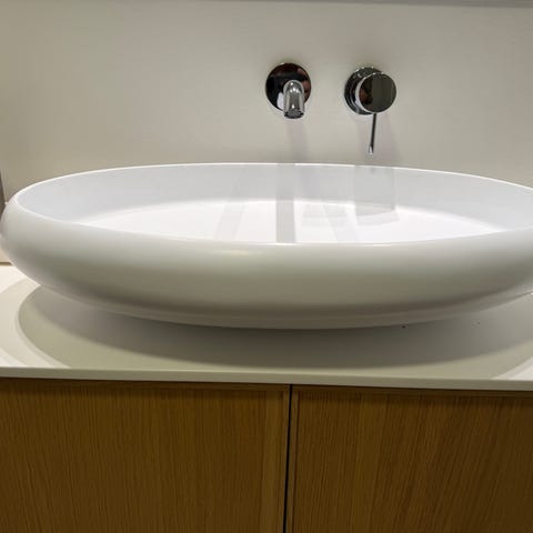 ONO rund vask i beige farve.diameter på cirka 40 cm. Den er designet til brug i badeværelser eller lignende miljøer.