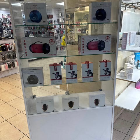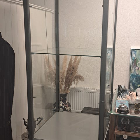 2 store glasmontrer, der åbner hver sin vej. Montrerne er i stål og har huller indvendig til isætning af hylder - der er sat aluminiums lister i den ene til at sætte løse hylder ind.