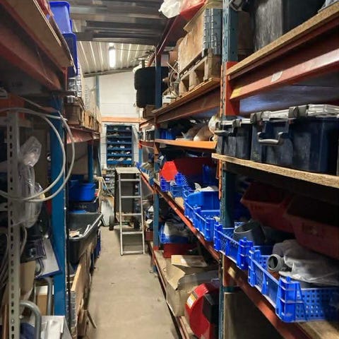 Dexion reol med en maksimal belastningskapacitet på 3x500 kg. Reolen har 4 gavle og 8 vanger med hylder.