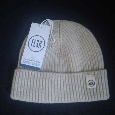 Fin strikket hue i hvid uld med pelskvast (ægte pels) fra Feldur Verkstædi. Købt i Island.