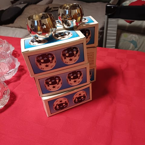 Smukkeste Holmegård fyrfads stager med hank, guldkant og guldmønster, kan stå eller hænge. 45 kr pr stk eller 2 for 80. Stort guld metal fad, 38 cm i diameter, 45 kr