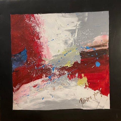 Kæmpe Robert Yong-maleri med abstrakte mønstre og farveblokke i gule, hvide, sorte og brune nuancer. 177 x 69 cm. Maleriet har en signatur i nederste højre hjørne og er fremstillet på lærred. Ophæng til både lodret og vandret placering. Købt i 2005 hos G&C.