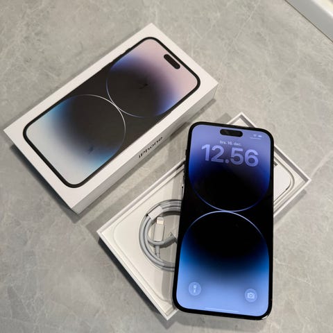Apple iPhone 14 Pro Max med 256 GB lagringskapacitet i sort farve. Panzerglas er stadig på. Fejlder ingenting