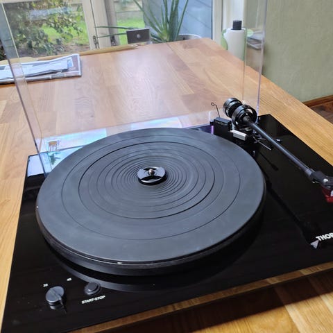 Fin pladespiller til lp'er og singler. 33 eller 45 omdrejninger. Med gentager funktion. Linear pickup arm. Har indbygger strømforsyning.