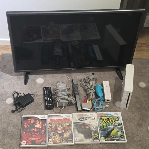 Nintendo wii med 1 controller sæt, 4 spil samt kabler. Medfølger 32" tv (ikke smart tv). Perfekt til sommerhuset eller børneværelset.