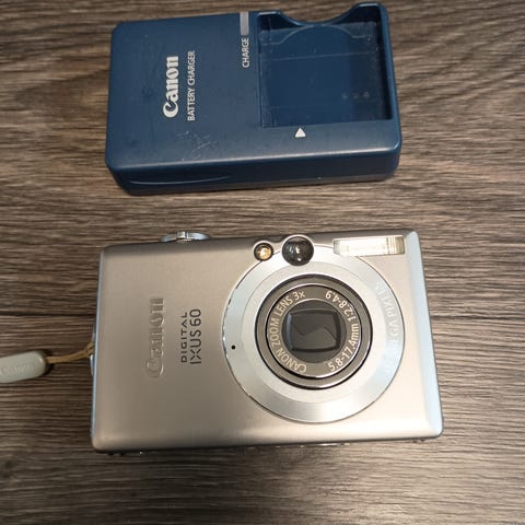 Canon Digital IXUS 60 Digitalkamera i sølvfarve. Kompakt design med indbygget objektiv og 2,5-tommer LCD-skærm. Leveres med batteri, oplader, brugervejledning og beskyttelsesetui.