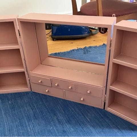 Hyggeligt skab med skuffe, hylder og spejl. Perfekt til pigeværelset.