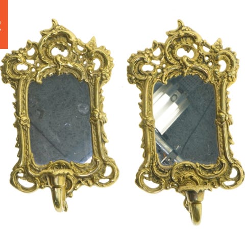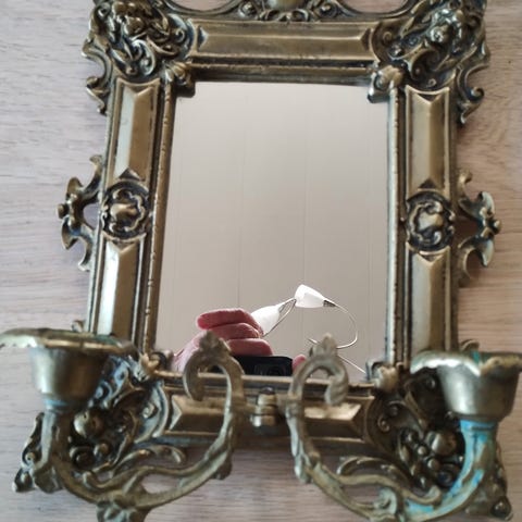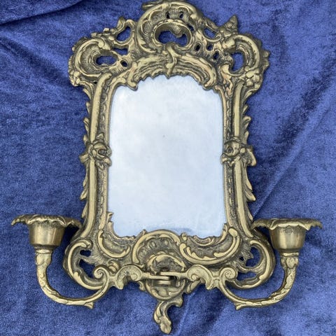 Sælges Lille spejl med guldramme Str. L 40 cm. H 29 cm. Pris 45 kr. Sælges 2 stk messing lysestage H 21 cm. samlet Pris 50 kr.