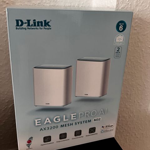 Sælger ubrugt Wifi mesh D-Link EAGLE PRO AI M32 AX3200 Wi-Fi 6 Mesh System (2-pak). Sælges da jeg fandt ud af at den ikke kan forbindes trådløst til routeren. Kvittering haves. Kan godt sendes. Købt for 1800kr.