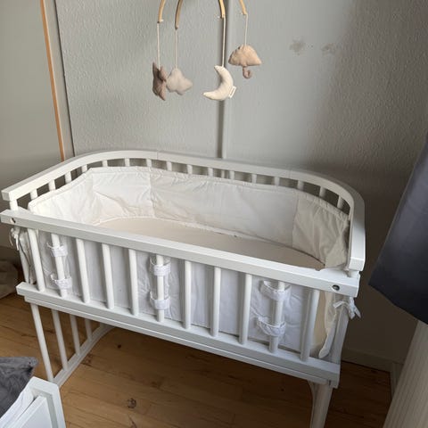 Babybay Bedside crib i hvid. Designet til at placeres ved siden af sengen for nem adgang til barnet. Fremstillet i træmateriale med spiler hele vejen rundt. Passer til børn fra 0 til 14 måneder.