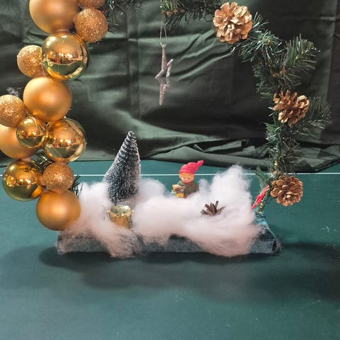 Julepyramide i træ der måler 56 cm i højden. Den består af fire etager med udskårne figurer og en roterende propel øverst. Den fremstår i pæn stand, med almindelige brugsspor (rester af stearin i lysholderne). Den virker desuden som den skal.