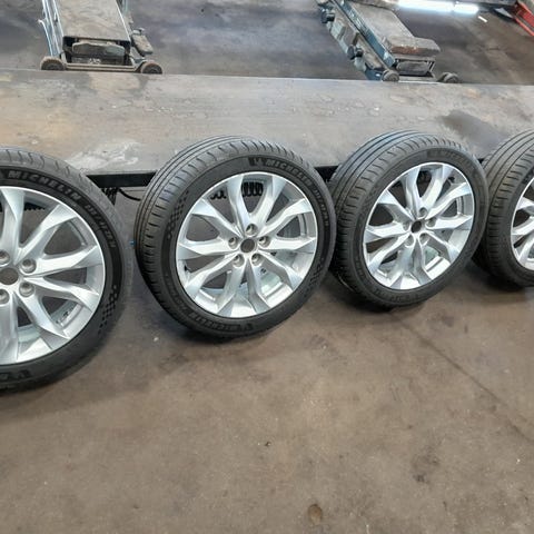 18 tommer Mazda fælge. Dækkene er af mærket Bridgestone med dimensionerne 235/60 R18. Stadig lidt slidbane tilbage, men skal skiftes inden længe. Har siddet på en Mazda CX60. Mazda logo kan fjernes. Kom med et bud.
