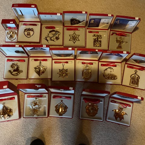 Georg Jensen juleuroer i original æsker og med årsbånd fra forskellige årgange.