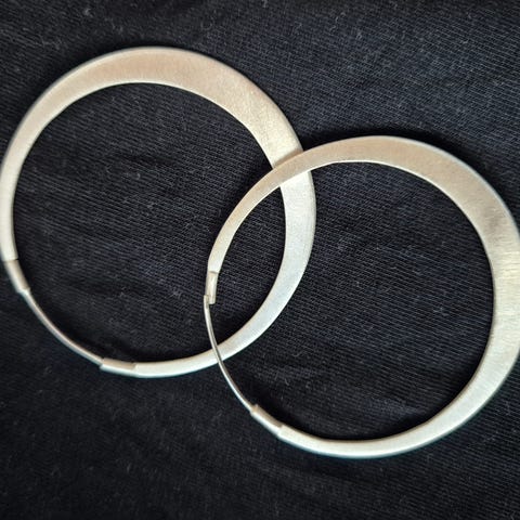 Øreringe lavet af sterlingsølv med en længde på 4,3 cm. Designet med en glat, let buet form, der hænger fra øret. Materialet er 925 sterlingsølv, hvilket sikrer holdbarhed og kvalitet.