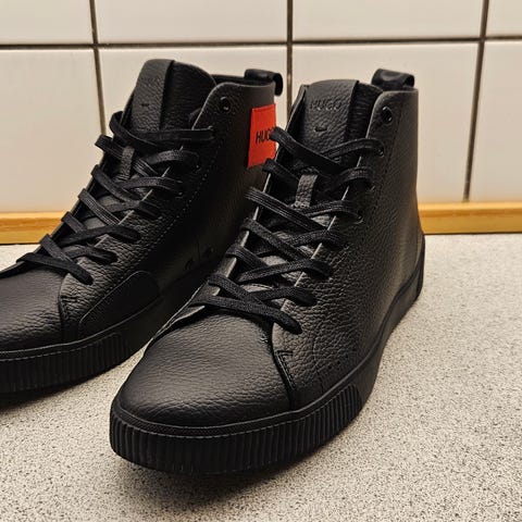 Hugo Boss sneakers i størrelse 43, lavet af brunt læder. Skoene har snørebånd og en lav profil, designet til hverdagsbrug. Materialet og konstruktionen giver et klassisk og holdbart udseende. PERFEKT JULEGAVE 🎄