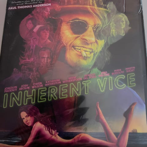 Inherent Vice DVD film med Thomas Pynchon som forfatter. Inkluderer ekstra materiale som kommentarspor og slettede scener. Filmen har aldersgrænse 15 år og indeholder Dolby-lyd.