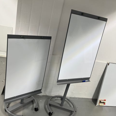 Whiteboard med metalramme og hjul for nem flytning. Tavlen kan vippes for at ændre skrivevinklen. Velegnet til kontor eller undervisningsmiljøer.