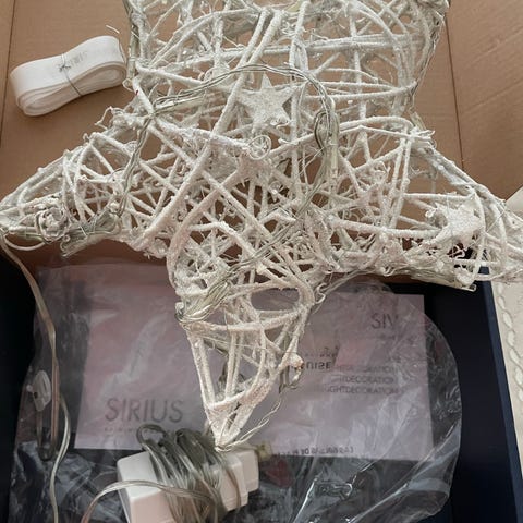 Fin julestjerne i træ, som giver et blødt og behageligt gulligt lys. Æske medfølger. Ny pris 400 kr.