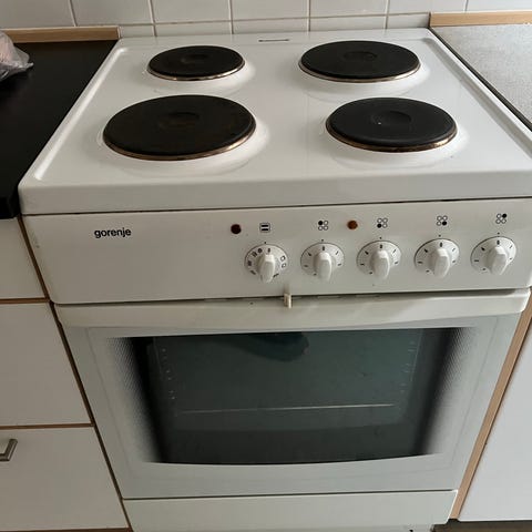 Gorenje Kogeplade komfur med fire kogezoner og ovn. Komfuret er hvidt og har betjeningsknapper foran til justering af varme. Ovnen har indvendig belysning og rist til madlavning.