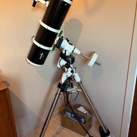 Sky-watcher d150 f750 telescope i næsten ny tilstand samt en del udstyr. Følgende okkularer= CELESTRON 5mm. CELESTRON 25mm. OMEGON 2• BARLOW LENS. OMEGON PLOSSL 6mm. OMEGON 15mm. OMEGON SUPER 10 LONG EYE RELIEF. Månefilter samt rød/blå filter samt kompas. Mobilholder til montering på telescope. Transport taske til teleskop spritny. Samt en super SKYWATCHER 12 VOLT D.C.RECHARGEABLE MOBILE POWER STATION MED KRAFTIG HVID LAMPE SAMT RØD NATTELAMPE SAMT 2 USB OUTPUT 5V/1.5A evt til opladning af mobiltlf. Samt kabel til direkte montering på WIFI MOTOR. RED DOT SPOTTER TIL JUSTERING AF MÅL. ALT I ALT EN SUPERPAKKE MED NYPRIS PÅ LIDT OVER 9,000,- sælges nu for 5.000,- da jeg ikke får brugt den. “PS.SENDES IKKE “