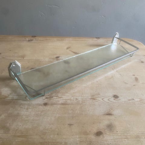Glasplade til hylde i klart glas med metalbeslag. Pladen er designet til at blive brugt som hylde og kan monteres med de medfølgende beslag. Materialet er glas, og designet er enkelt og funktionelt.