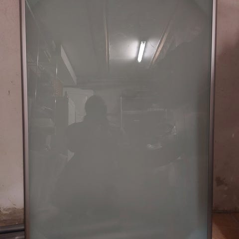 IKEA glasbord skrivebord med en glasplade og metalben. Bordet har en stor overflade, der egner sig til brug som skrivebord eller arbejdsbord. Farven på glaspladen er lys, og benene er sølvfarvede i metal. Bordet er velegnet til kontor- eller hjemmearbejde.