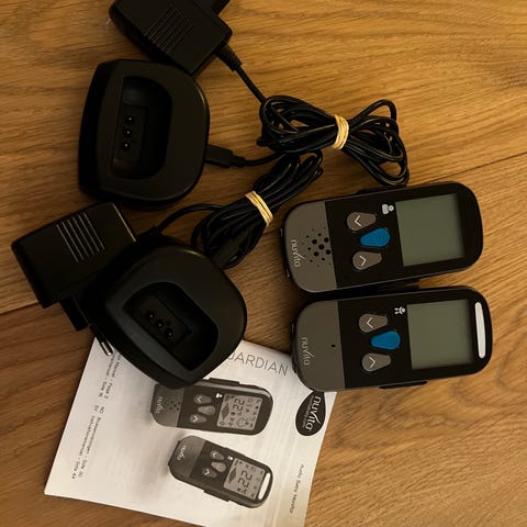 Baby Monitor med skærm og kamera, der inkluderer enheden med skærm og kameraenhed. Udstyret med strømforsyning og kabler. Designet til overvågning af babyer.