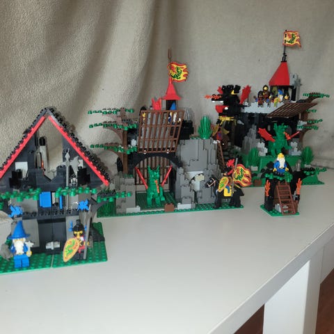 Enkelt sted er ændret pga. manglende klods, ses på de sidste billeder. Mangler den ene minifigur, men torso og ben er erstattet med én fra lignende sæt. Inkluderer sæt 1736 Wizards cart, med manglende fugl. Inkl. manual.
