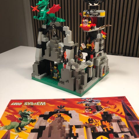 LEGO sæt 6082 Fire Breathing Castle med Minifigurer, flag og kappe.