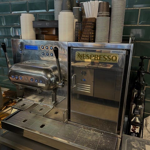 Til brug i caféer/restaurant. Brugt men fungerer som den skal. Bruger Nespresso kapsler. Med indbygget køleskab.