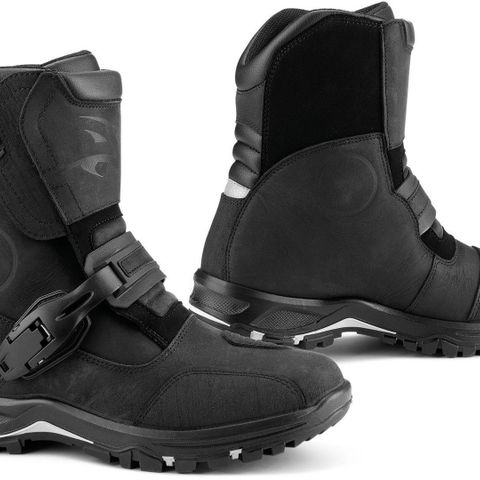 Falco motorcykelstøvler i sort farve. Støvlerne er lavet af læder og tekstilmaterialer med Velcro-lukning. Designet til beskyttelse og komfort ved motorcykelkørsel.