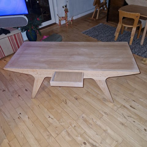 Velholdt sofabord i sæbebehandlet eg. 2 skjulte skuffer.