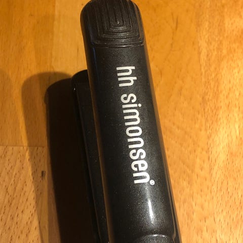 HH Simonsen rejsestørrelse glattejern med sort farve og ledning med dansk stik. Egnet til brug til at glatte hår. Ubrugt