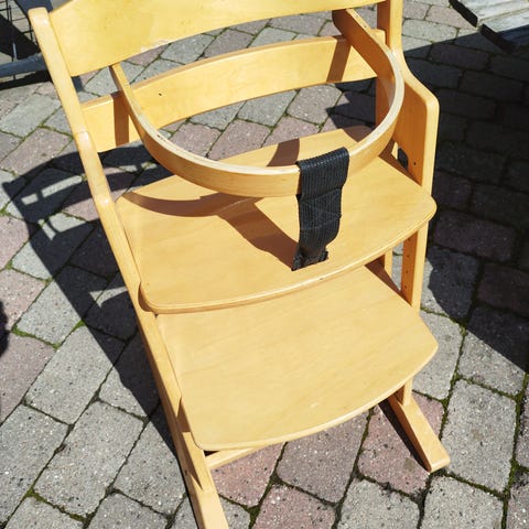 BabyDan højstol i træ. Højstolen er designet til børn og har en naturlig træfarve. Den har justerbare dele og er egnet til brug ved måltider og daglig brug.