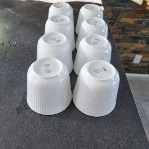 Sælger 11 stk. Hvid Riflet mokkakopper med 13 matchende underkopper, alle i meget velholdt stand – som nye.