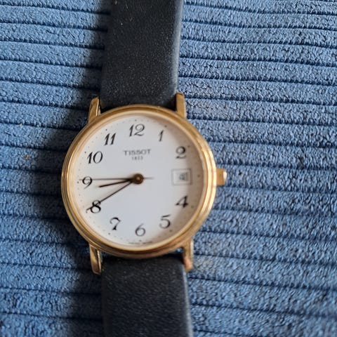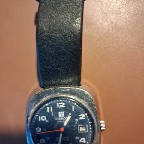 Tissot unisex ur med sort urskive og sort læderrem. Uret har en rektangulær urkasse og viser tid med analog display. Remmen er lavet af læder med syninger langs kanterne.