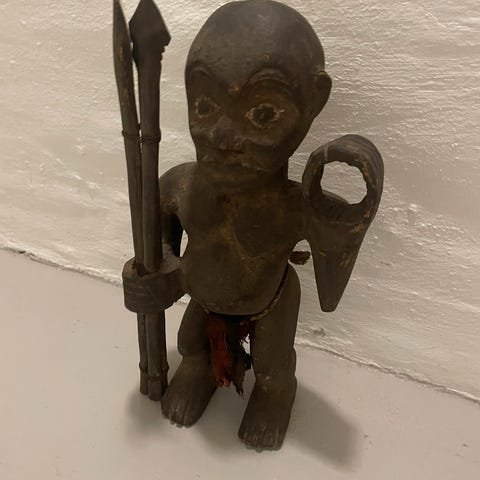 “Tung afrikansk skulptur i sort sten. Stiliseret kvindebuste med roligt udtryk. Ca. 24 cm høj. Massiv og dekorativ.”