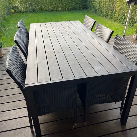 Udendørs spisebord med tilhørende stole, fremstillet i træ og metal. Bordet er rundt med en diameter, der passer til seks personer. Stolene har armlæn og ryglæn med trælameller og metalstel. Velegnet til brug i haven eller på terrassen.