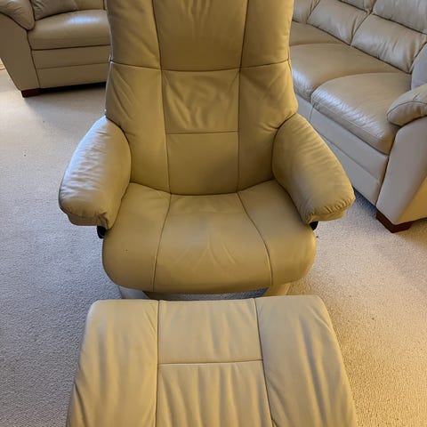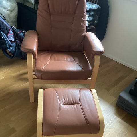 Sælger mine flotte og komfortable læderlænestol med tilhørende skammel. Stolen er brugt, men i god stand og velholdt, med kun almindelige brugsspor. Læderet fremstår pænt og stolen er stadig rigtig behagelig at sidde i.