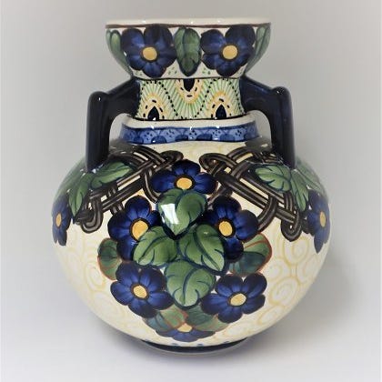 En sjælden og smukt dekoreret fajancevase i en særpræget pæreform med en slank hals.