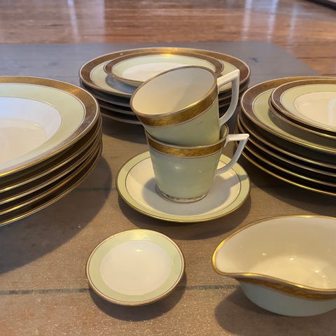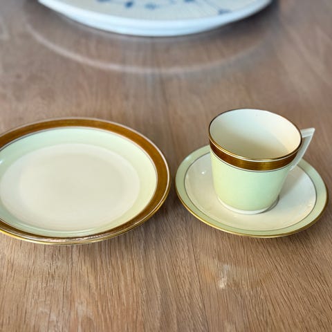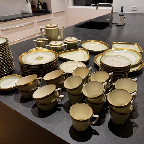 Royal Copenhagen 9633 spisestel med guldkant. Servicet består af tallerkener, kopper med underkopper og skåle i porcelæn. Designet har en grønlig nuance med guldkant, hvilket giver et klassisk og elegant udtryk. " Dagmar ". Består af 36 dele: 6 par kopper 6 dessert tallerkner 17 cm. 11 frokost tallerkner 19 cm. 4 tallerkner 22 cm. 4 tallerkner 25 cm. 1 lille oval fad 21. cm. 1 oval fad 27 cm. 2 runde skåle 21 cm. 1 stort rund fad 39 cm.