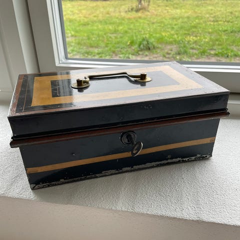 En fin gammel bankboks kassette i fint patineret metal og flot nittet messing beslag med låseanordning og håndtag. Flot til udsmykning / indretning. Kan afhentes i 3320 Skævinge eller sendes efter aftale.