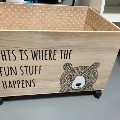 Træ kasse på hjul fra Bloomingville. Tekst på to sider : notning is really lost until your mom can’t find it