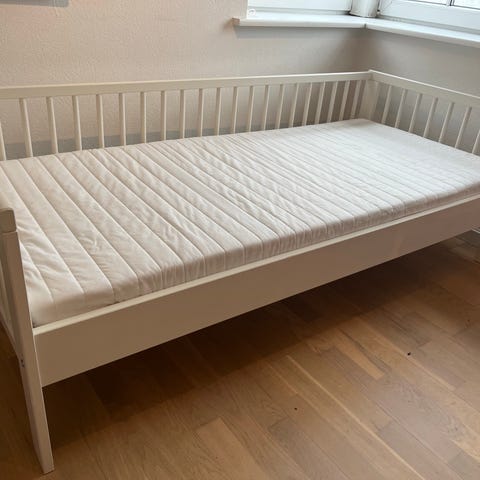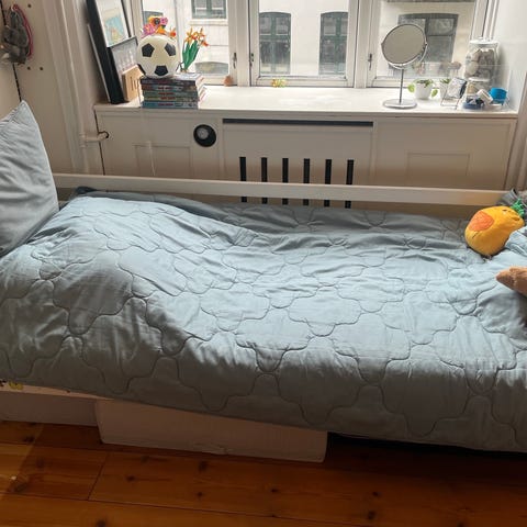 Sengen har brugsspor efter diverse enhjørning og regnbue klistermærker.
